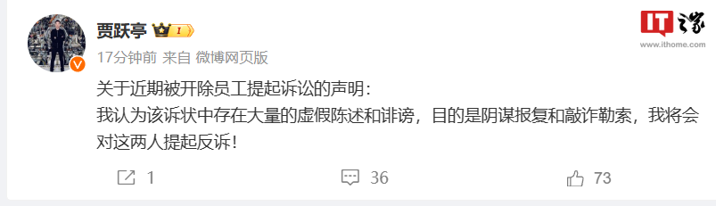 对此,贾跃亭在其微博发布声明:我认为该诉状中存在大量的虚假陈述和诽谤,目的是阴谋报复和敲诈勒索,我将会对这两人提起反诉!